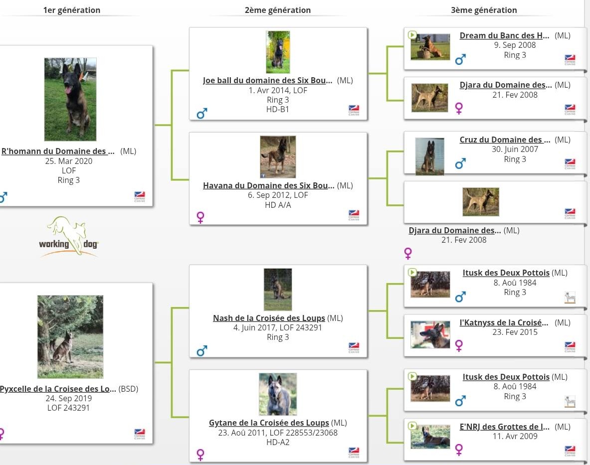 - Lice: Pyxcelle de la Croisée des Loups ( Shaltyre ) Lignées exceptionnelle basée sur les sangs "deux pottois" 2 x Itusk, veomar, Ivan par laos HD A/A, Ed 0 et ADN et Toutes maladies génétiques testées !! ~~~~~~~~~~ - Etalon: R'homann du domaine des six bourgeois Lignée Eriem et A'Tim Ring III, HD A/A ED 0 ADN et Toutes maladies génétiques testées.